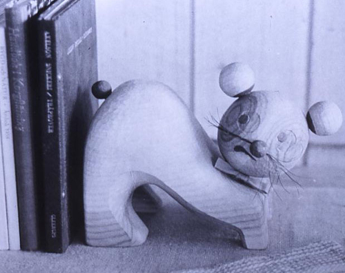 猫のモチーフをブックエンドに活用した。四足で立ってお尻で支える形と、お尻で座って四足で支える二つのポジションがある。顔の表情にもユーモアを表現する。