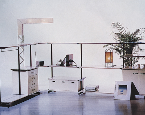 棚以外のアイテムは6㍉ワイヤーで椅子とテーブルのフレームを構成している。 細かいネット部分とハンドルは4㍉を使った。座面や肘掛の木部と金属部分は製作を違えるため、できるだけシンプルな方法によるジイントを考えた。テーブル類とワゴンの取り付けも椅子と同じ構造である。棚の支柱は32㍉のパイプを使った。棚板の取り付けは板と桟で支柱を挟みビス止めで固定する。この方法によって任意の位置に棚板の固定を可能にしている。椅子における鉄の活用は細くても丈夫である。その上柔らかく躯体を構成し、体をサポートする素材の剛性が形状に調和して、その特性が生かされている。 ABITARE誌1983年9月号(ページ143)に掲載される。 2