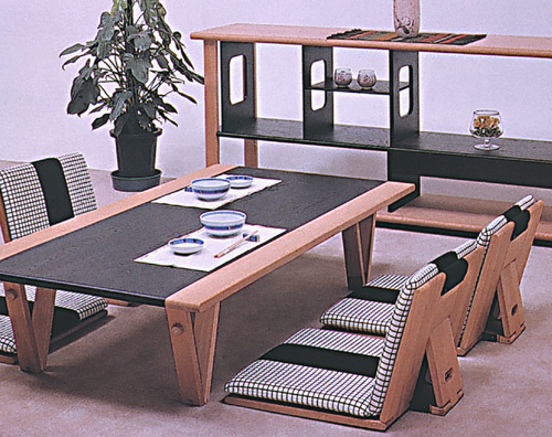 フオールディングの座椅子と座卓に飾棚を加えてシリーズとした。座椅子は背面の支えとなっている部分を前方へ押し込むと一枚の板状になる。背もたれの部分を起こして支えの穴に手を掛け引き出し、クッションを置いて使用する。座卓は裏面のロックをはずし、中心方向へ滑らせると低いテーブルとなる。イタリアのアビターレ誌1983年9月号の143ページに掲載される。