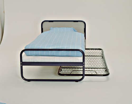 ブルーに塗装したパイプのフレームとヘッドボードにはパンチングプレートを使ってクールさと軽快感を表現した。